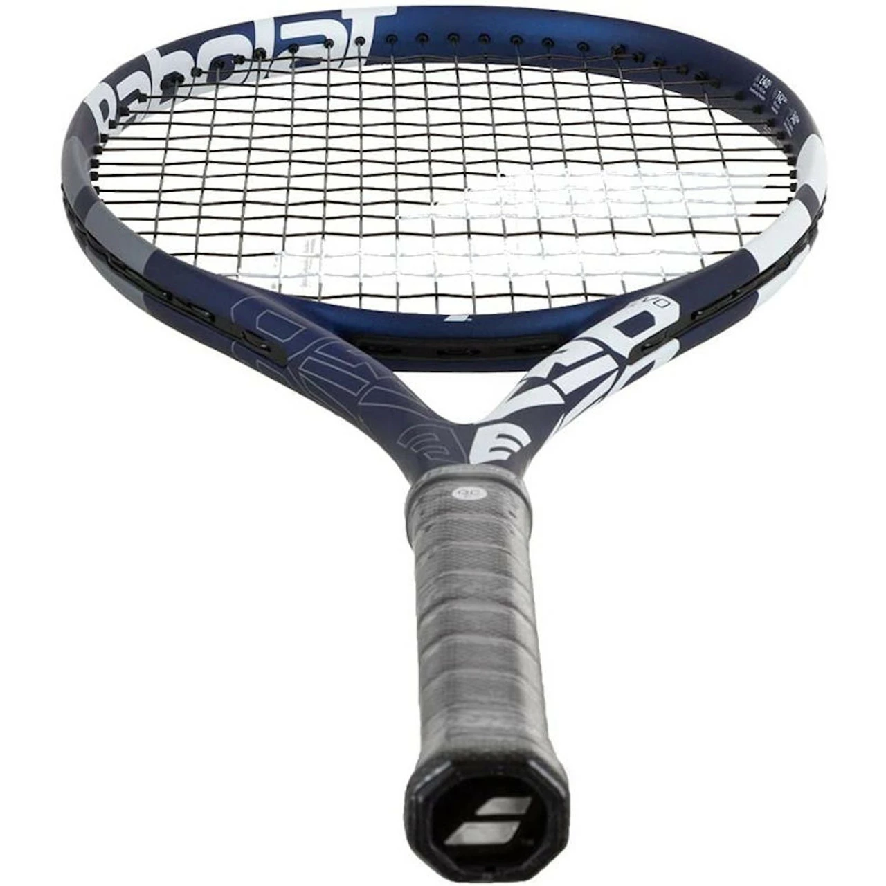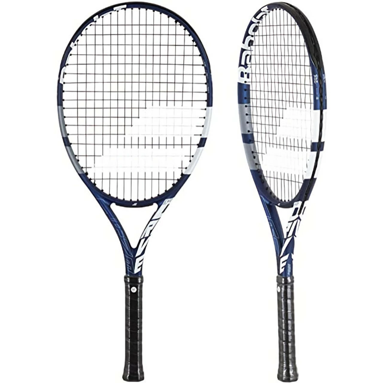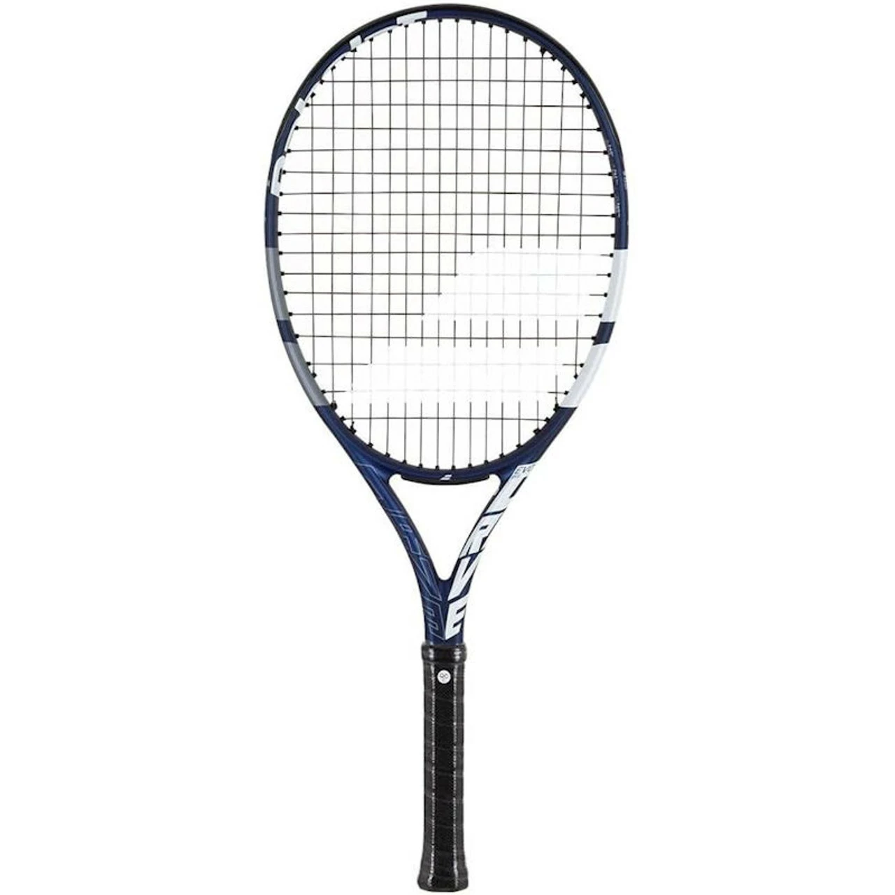 Deep blue and white racquet strung with black Babolat Synthetic String